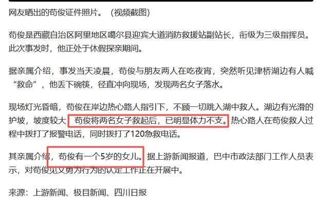 同样在28日凌晨离去的还有一位“英雄”,34岁的苟俊在凌晨吃夜宵, 在听到有人大喊求救的时候,他义无反顾的冲着声音的方向跑去,发现是两位女子掉进了水里。