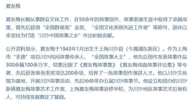 “川沙民间故事”或许很多人都没有听说过,但依然有人愿意默默传承,这就是老一辈艺术家的伟大, 夏友梅就是这个活动的代表性传承人,担任着多项职务,是个名副其实的“劳模”。